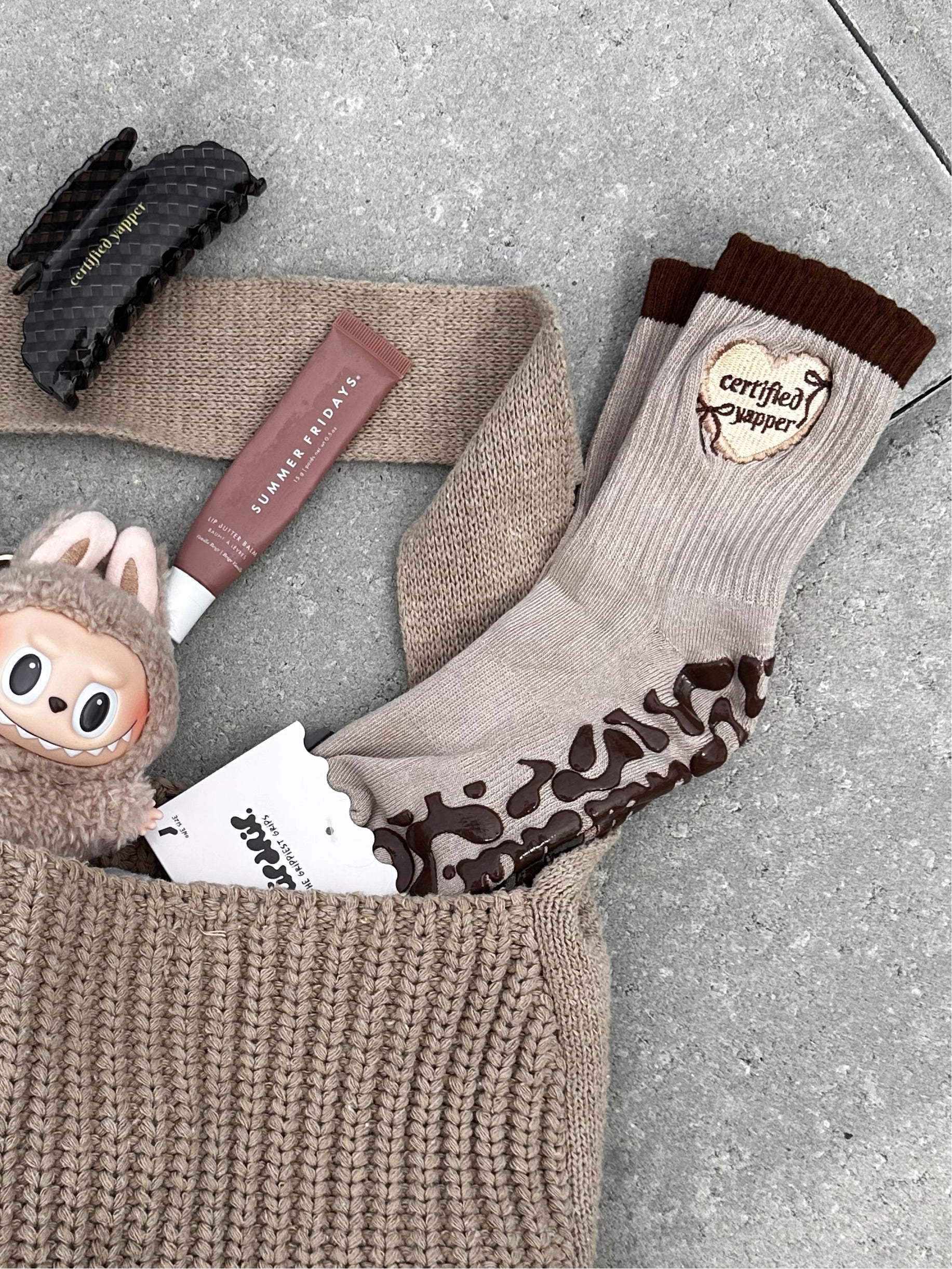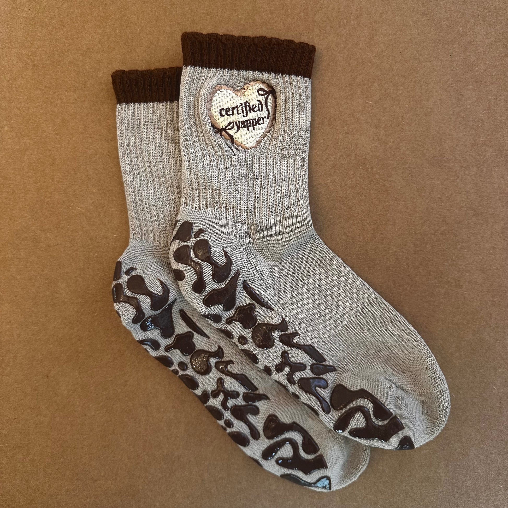 I am the "Certified Yapper 2" Sock and I am a short crew sock. I've been designed with top of the line grips to ensure you make the best out of your pilates, barre, lagree, yoga, ect, workout. I have a tan color base, brown bubble collar, embroidered design, and my classic grip in brown. I consist of a mix of special cotton blends to keep you comfy and keep sweat away.