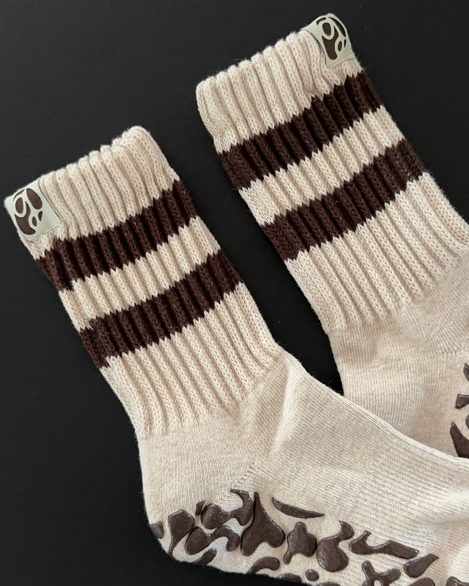 I am the "cream & mocha" Scrunch Sock and I am a short Scrunch sock. I've been designed with top of the line grips to ensure you make the best out of your pilates, barre, lagree, yoga, ect, workout. I have a heathered cream base, beautiful mocha colored stripes, and my classic grip in an a matching mocha color. I consist of a mix of special cotton blends to keep you comfy and keep sweat away.