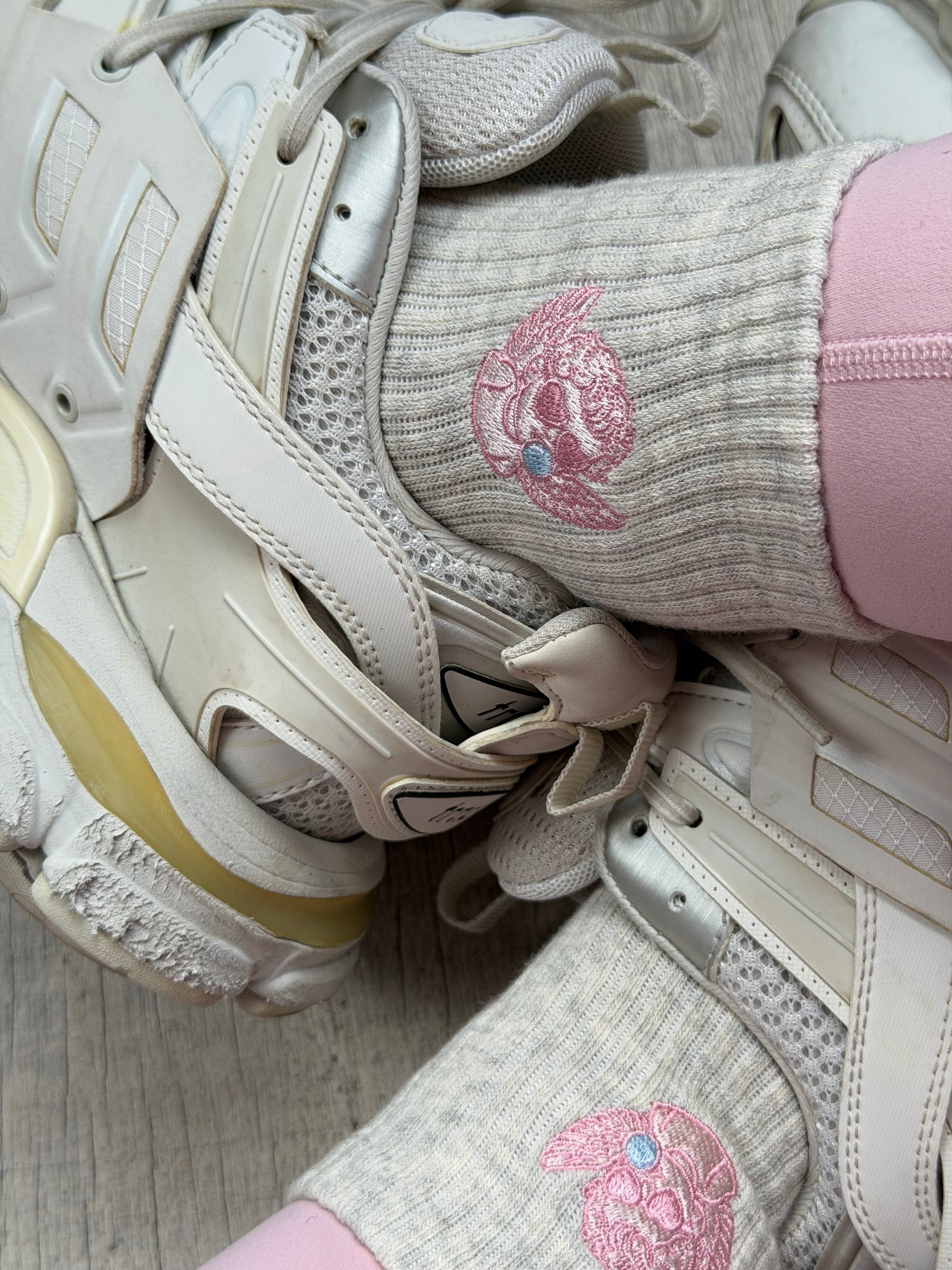 I am the "cupid " Sock and I am a quarter crew sock. I've been designed with top of the line grips to ensure you make the best out of your pilates, barre, lagree, yoga, ect, workout. I'm a heather light grey color with a custom and cool embroidered design and my matching pink grip. I consist of a mix of special cotton blends to keep you comfy and keep sweat away.