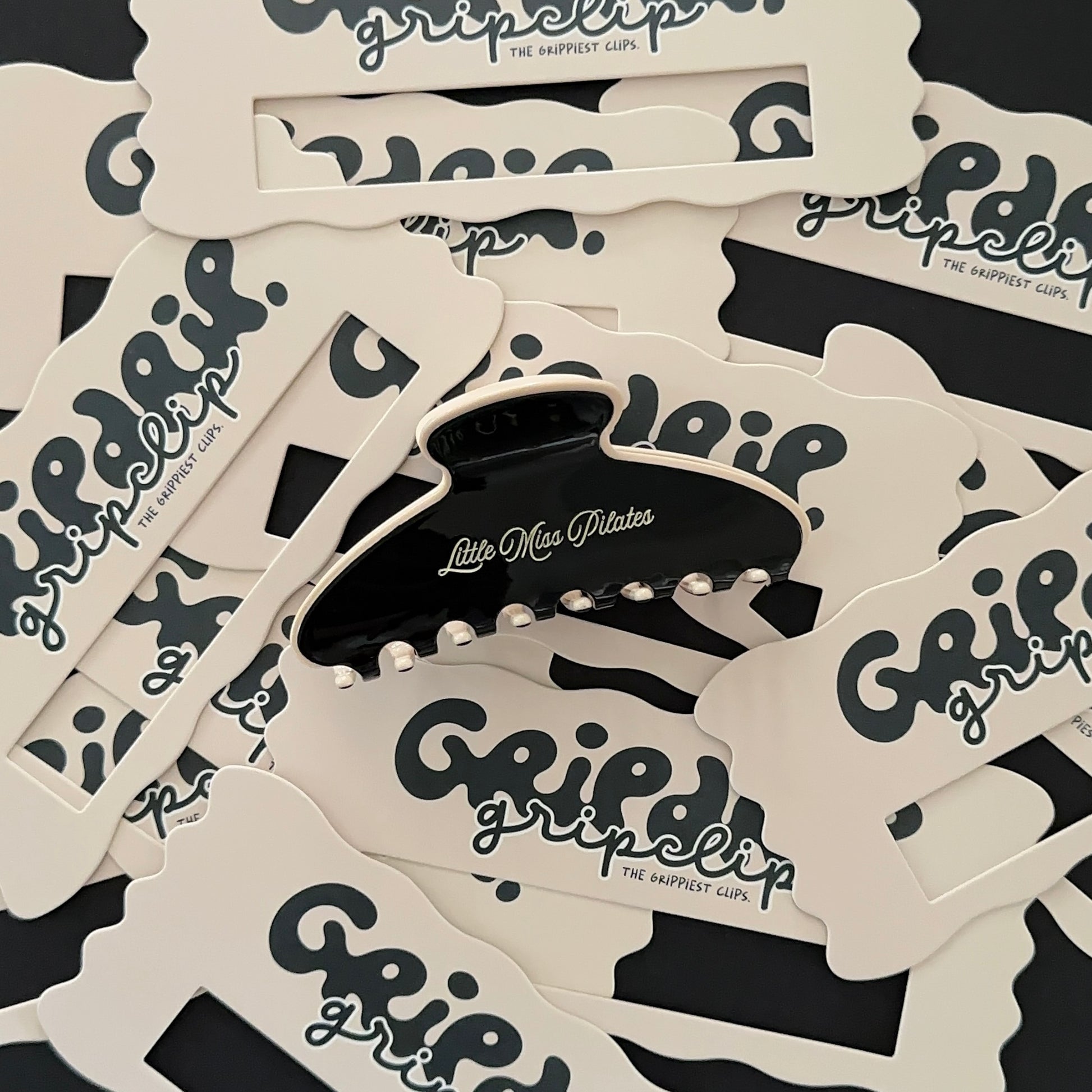 I am the “Little Miss Pilates” Clip and I’m designed to hold it all together. I have a the perfect beige inside, with black finish outside; along with an engraved beige logo. I’m made of 100% acetate fiber — stronger, biodegradable, lightweight, and non-toxic — so I keep your hair secure and comfy all day.