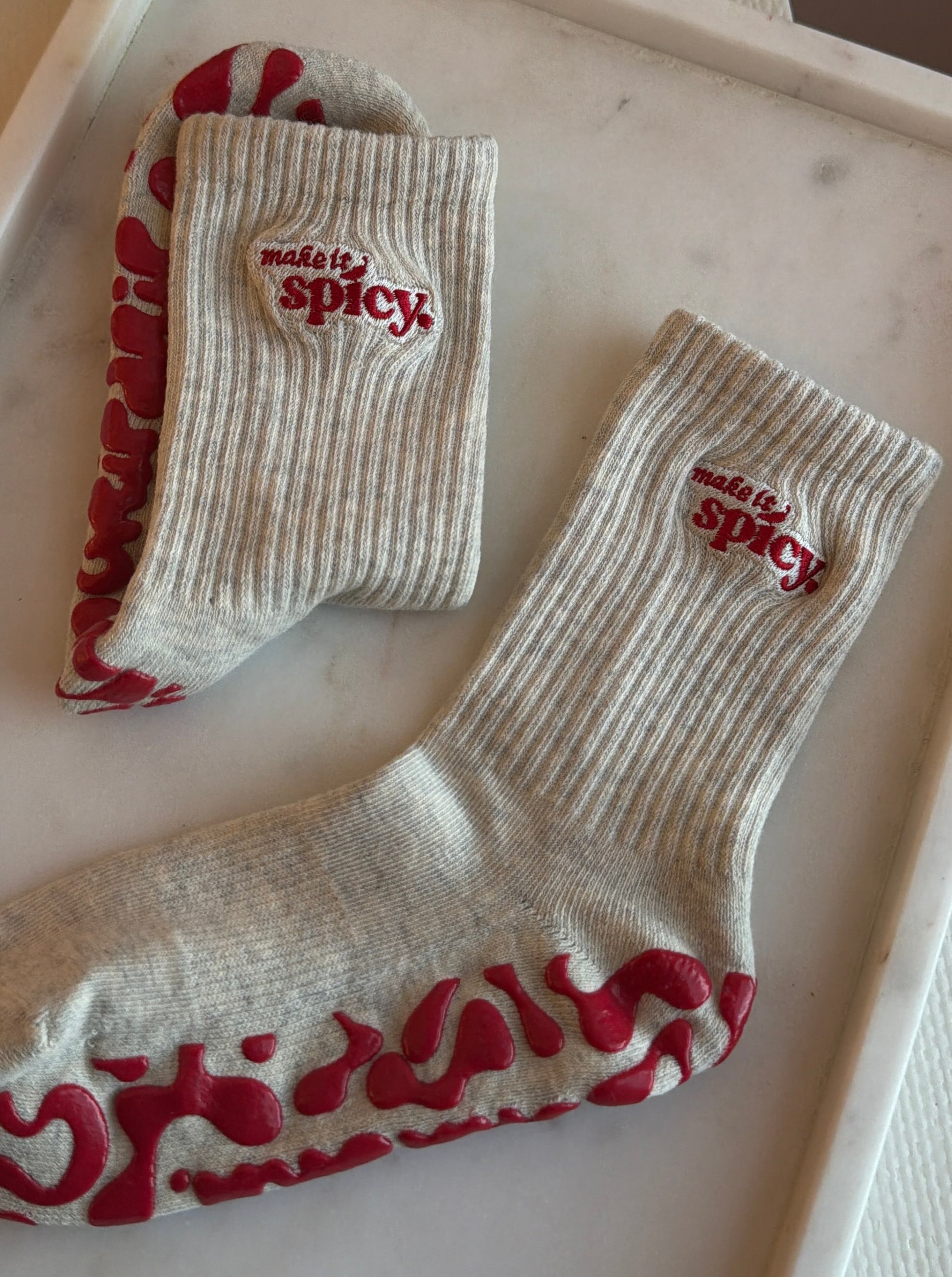 I am the "make it spicy" Sock and I am a quarter crew sock. I've been designed with top of the line grips to ensure you make the best out of your pilates, barre, lagree, yoga, ect, workout. I'm a heather grey color with a custom and cool embroidered design and my classic red grip. I consist of a mix of special cotton blends to keep you comfy and keep sweat away.