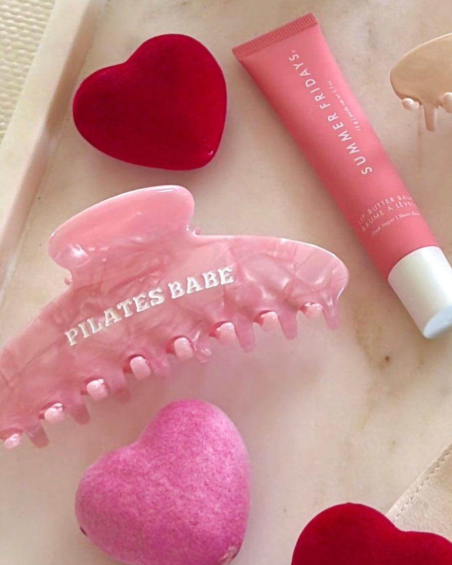 I am the “Pilates” Clip and I’m designed to hold it all together. I have a pink and pearl white marbled finish; along with an engraved white logo. I’m made of 100% acetate fiber — stronger, biodegradable, lightweight, and non-toxic — so I keep your hair secure and comfy all day.