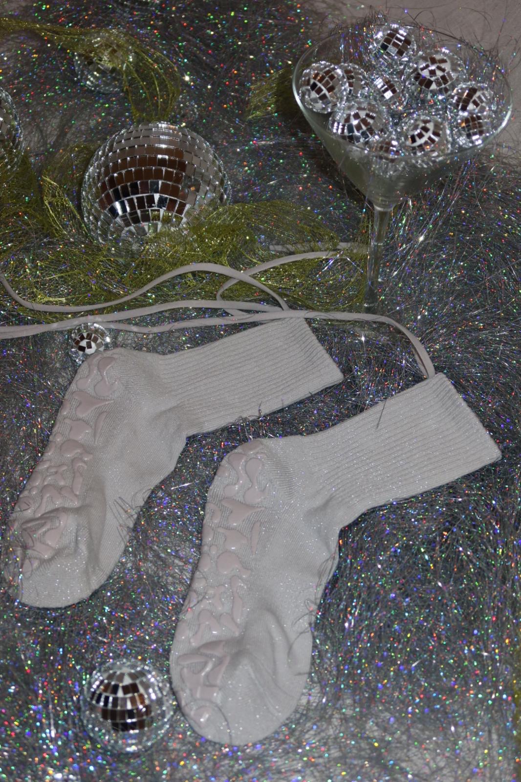 I am the Starlight Sock and I am a Tall crew sock. I've been designed with top of the line grips to ensure you make the best out of your pilates, barre, lagree, yoga, ect, workout. I have a grey base with silver sparkles threaded between each thread of yarn giving the most subtle yet elegant sparkle. The best part about me, I come with laces, tie me up into the prettiest bow for an edgy ballerina vibe. My grippiest grips are a matching grey color. I consist of a mix of special cotton blends to keep you comfy and keep sweat away.