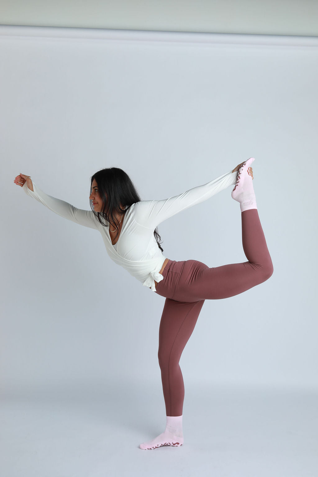 I am the "Literally Just a Girl" Sock and I am a short crew sock. I've been designed with top of the line grips to ensure you make the best out of your pilates, barre, lagree, yoga, ect, workout. I have a soft pink color base, rosey pink & ivory embroidery, and my classic grip in white. I consist of a mix of special cotton blends to keep you comfy and keep sweat away.
